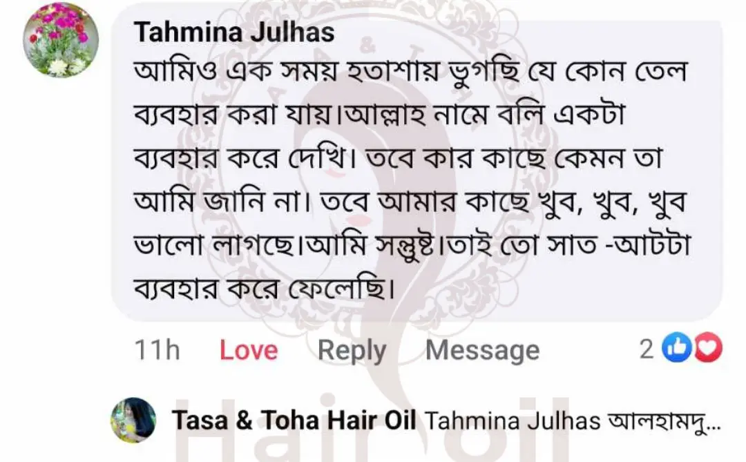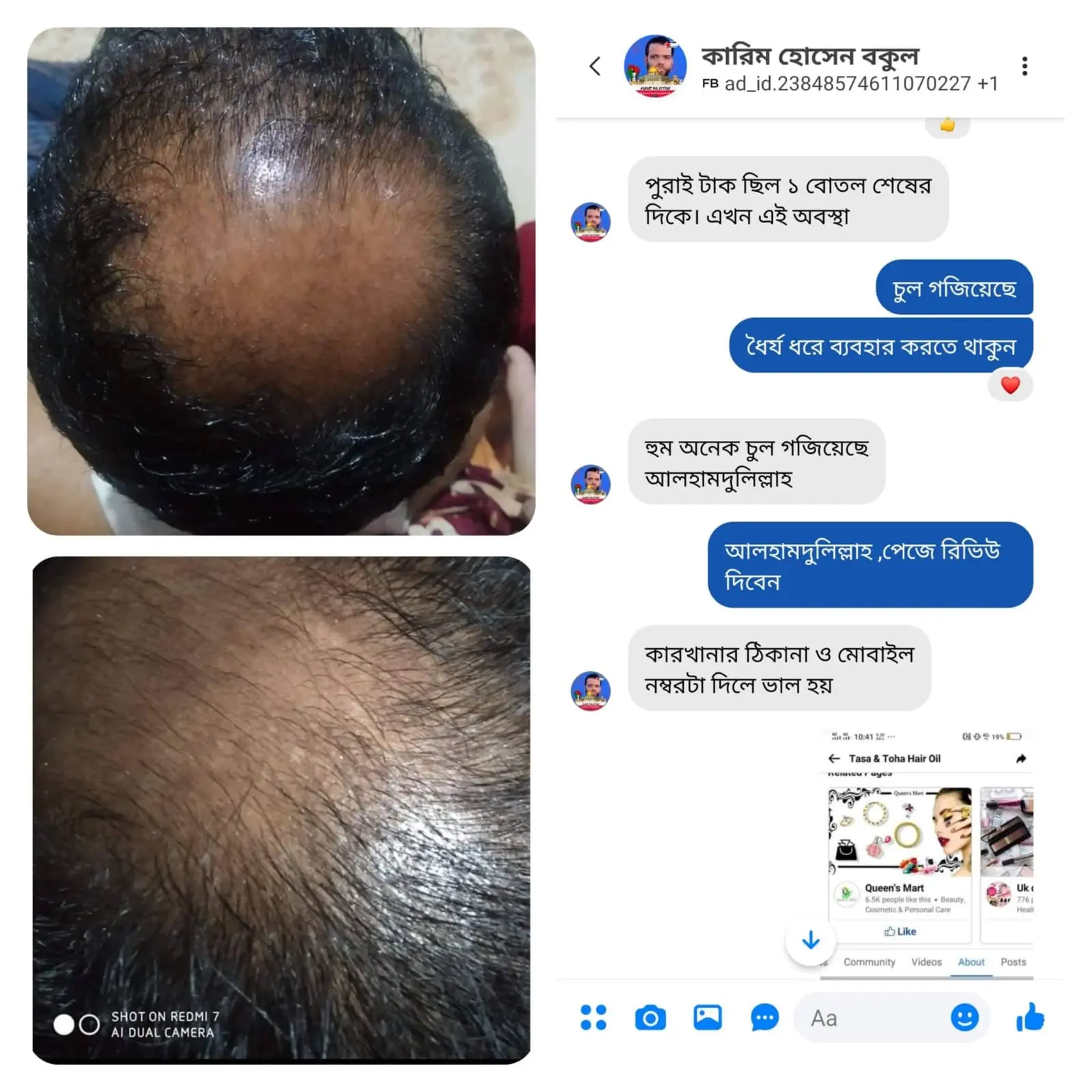 তাসা এন্ড তোহা হেয়ার অয়েল, ১০০% হারবাল উপাদানে তৈরি এই তেল শুধু চুল পড়া কমায় না, নতুন চুল গজাতে সাহায্য করে, মাথার ত্বক ঠাণ্ডা রাখে আর চুলকে করে মসৃণ ও ঘন। কোনো কেমিক্যাল বা ক্ষতিকর উপাদান ছাড়াই দীর্ঘদিন ব্যবহারেও পার্শ্বপ্রতিক্রিয়া নেই। লাখ লাখ রিয়েল কাস্টমার রিভিউ প্রমাণ, এই তেল চুলের প্রকৃত বন্ধু।
